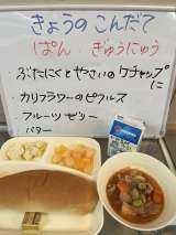今日の給食は、「ミートボールとやさいのカレーに」「ツナとキャベツのソテー」「リ...