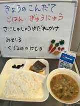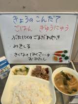 今日は、「ぶたにくのごまだれやき」「みそしる」「きくなとはくさいのおひたし」で...