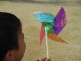 図画工作科で作った「かざぐるま」、カラフルに色をぬって、風のいきおいで、クルク...