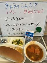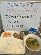 今日の給食は「ぎゅうにくと、きんときまめのカレーライス」「ごぼうサラダ」「パイ...