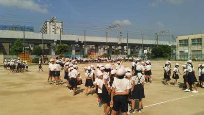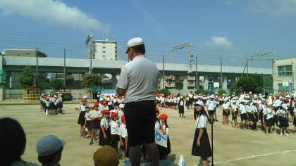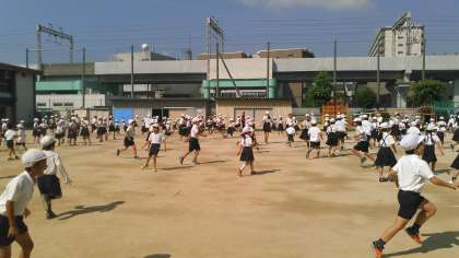 さて、写真は今朝の集会で実施しました「増え鬼」の様子です。危険防止のため2グループに分かれて行いました。