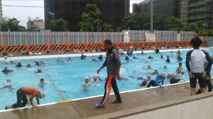 7月9日(火)先週末に着衣泳を行いました。自然災害や事故で海や川に入ってしまったときに生き延びる方法を指導しました。服を着たまま入水すると自由に体が動かせなくもがいているうちに体力を消耗してしまいます。近くにある浮くものを利用して長時間浮いていられる方法を学んでいます。