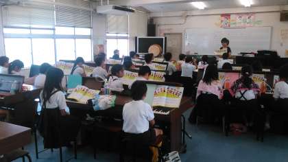 7月17日(水)4年生の音楽の授業風景です。プール水泳の後の授業で更衣や移動が大変ですが、授業が始まると楽しく歌えていました。