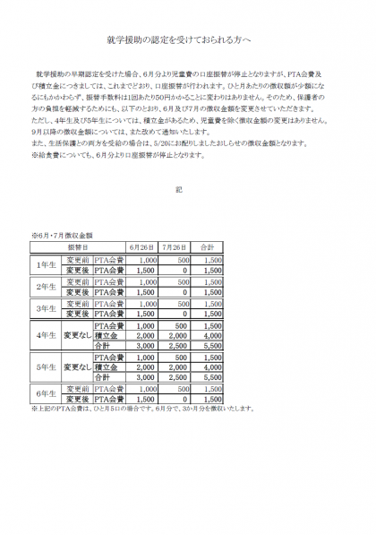 ただし、就学援助の早期認定となられた方は、積立金・PTA会費のみの振替となります。