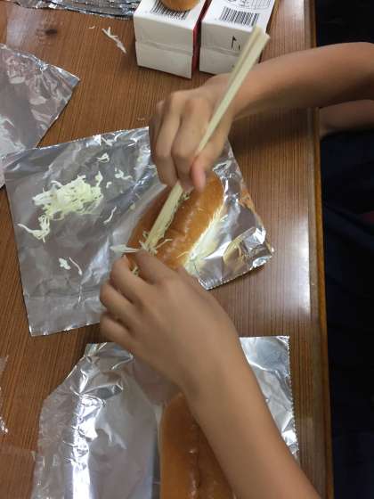 キャベツをパンに詰めます。下準備ありがとうございます!