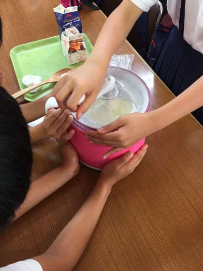 牛乳・生クリーム・砂糖を入れて、アイスクリームマシーンをぐるぐる回しています。協力の場面です。