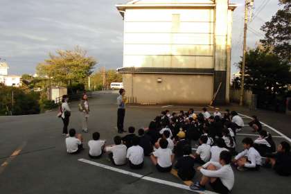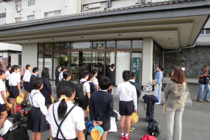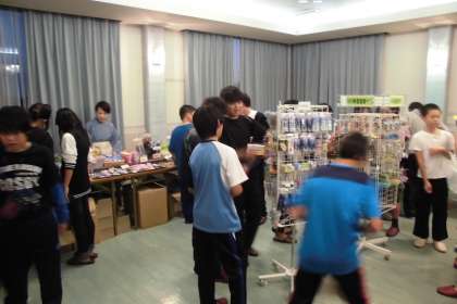 宿舎に着き、入舎式の後、避難訓練をしました。右は、特設のおみやげコーナーで買い物をしている様子です。