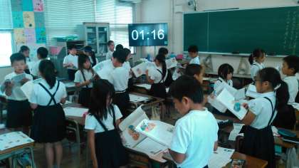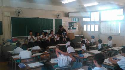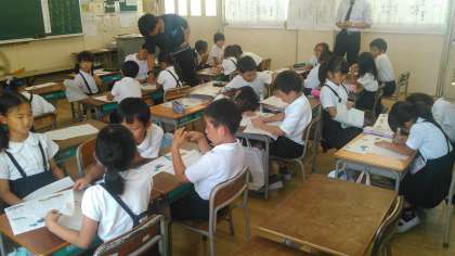 写真は、今日の授業のためのプレ授業の様子です。子どもたちは、頭を働かせてがんばっていました。