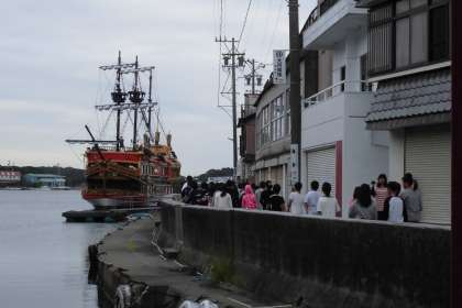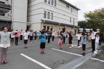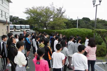 2日目の朝、宿舎の駐車場で朝の集いをしました。ラジオ体操の後、スケジュールの確認などを行い散歩に出ました。