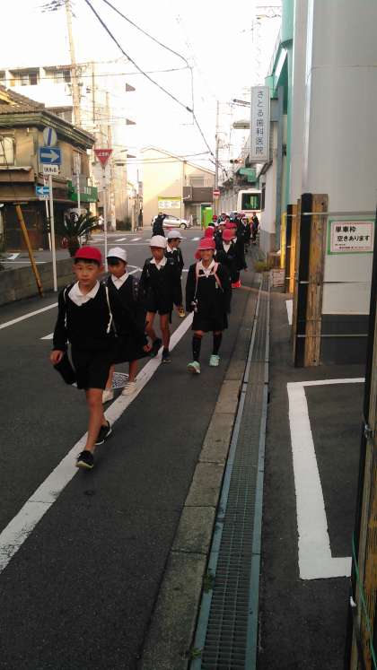 写真は、先日、長居競技場で行われたスポーツ交歓会に6年生が出発したところです。