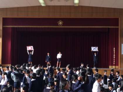 10月30日(木)児童集会で○×クイズをしました。取材で集めた情報を使って難解なクイズを用意してくれました。