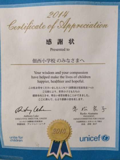 ユニセフから佃西小学校宛に感謝状が届きました。校長室の前に掲示しています。