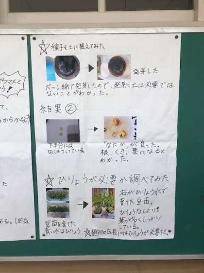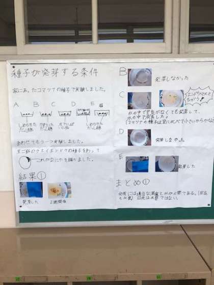 休業期間中に理科の実験をした5年生児童が、実験方法や結果をまとめてくれました。理科室に掲示しています。