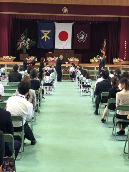 入学式の後、2年生が作ってくれたメダルを校長先生から受けとりました。