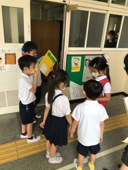 1・2年生がグループで学校たんけんをしました。2年生が1年生に上手に各教室の説明をしていました。