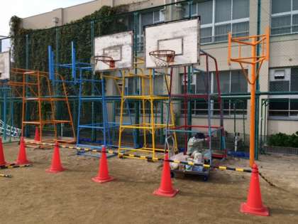 管理作業員さんが、バスケットゴールの支柱を塗り替えてくれています。3学期には今までより楽しくゲームできることでしょう。(右図)
