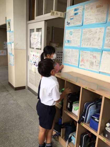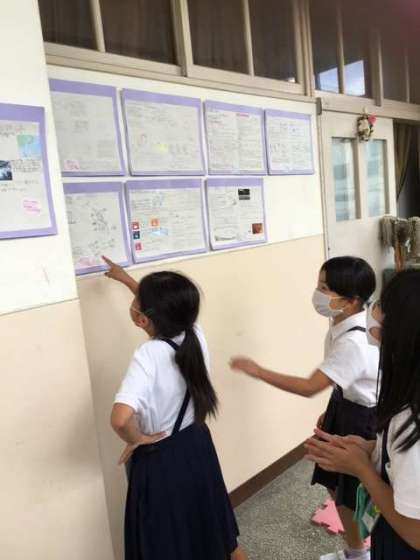 4年生が5年生のレポートに投票しています。一人3枚のシールを良いと思ったレポートに貼っていきます。