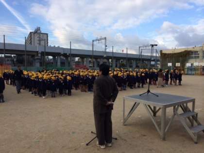 1月7日(水)始業式を行いました。普段は講堂で行いますが、工事中のため運動場での実施です。寒さに負けない佃西っ子でした。