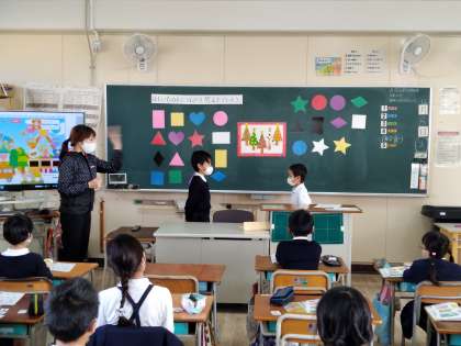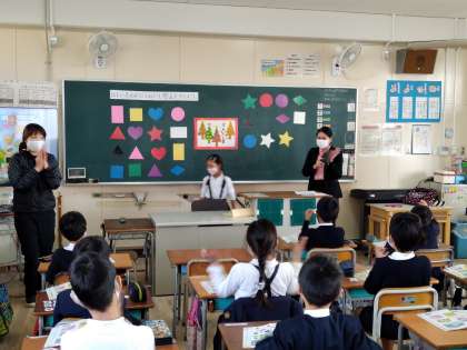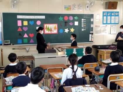12月8日(火)3年生の英語の授業です。英語の専科の先生とC-NETの先生で授業をしています。グリーティングカードに関連した教材で学習していますが、子どもたちは元気に発表していました。