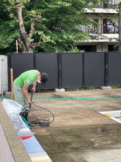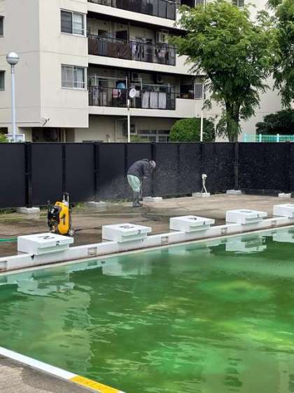 今日、管理作業員さんが高圧洗浄機でプールサイドの洗浄をしました。