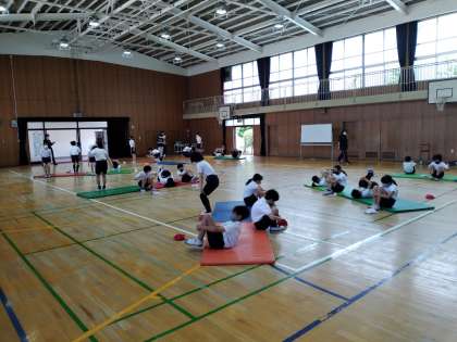 5月31日(月)緊急事態宣言が延長になり、学校行事が延期や中止しなければならなくなりましたが、校内では工夫した授業を行っています。写真は、6年生のマット運動の様子です。練習する前と後とで動画を撮影し技術の向上をめざしています。