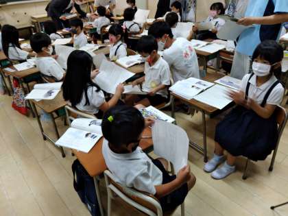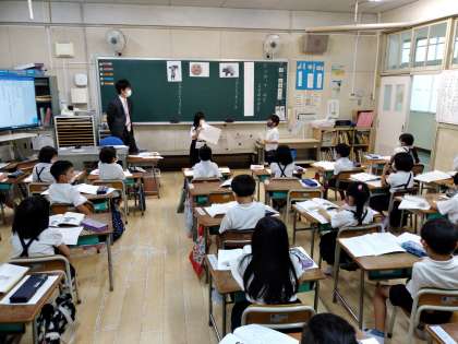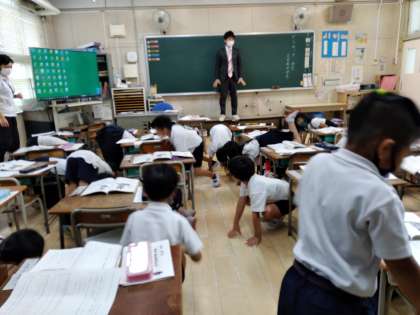 7月15日(木)昨日は、天候の急変で傘をご持参いただいたりお迎えに来ていただいたり大変ご苦労をおかけしました。本日も未明に大きな雷があり、大阪市には大雨と洪水警報が出されていました。そのような状況でしたが、5時間目に授業研究を行いました。1年生の国語の授業でしたが、子どもたちは動物になったり、大きな声で発表したり、友だちの意見をしっかり聞いたりしていました。