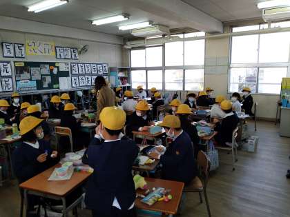 休憩時刻の少し前でしたが、放送で外に出ないようにアナウンスして教室で待機しました。写真は、帽子をかぶって学習している様子です。
