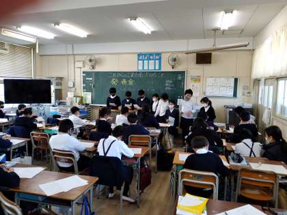 12月13日(月)2時間目が終わった休み時間に、1・3・5年生がなわとびをしました。その後、教室に戻って5年生は社会科の研究発表をしていました。高学年になると声が小さくなることが多いですが、子どもたちは聞いている人に研究の成果を伝えようと「ゆっくり、はっきり」と発表していました。