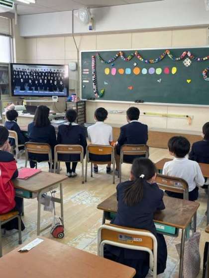 たてわり班に分かれて、各学年の合唱や合奏の動画を見たり、ゲームをしたりしました。