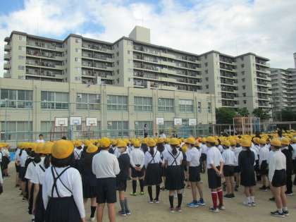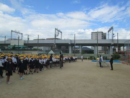 昨日は一日中雨でしたが、問題なく運動場で全校朝会を行うことができました。