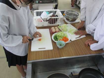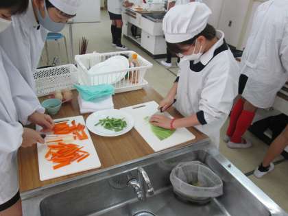 6年生では、家庭科「できることを増やしてクッキング」を学習しました。「いためる」を調理実習で学習します。