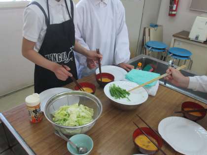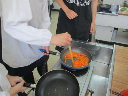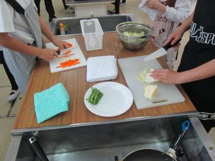 ニンジンはていねいに千切りします。キャベツと切り方を変えていますね。ピーマンも切れて炒める準備ができました。