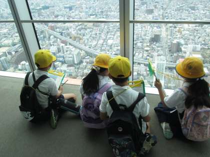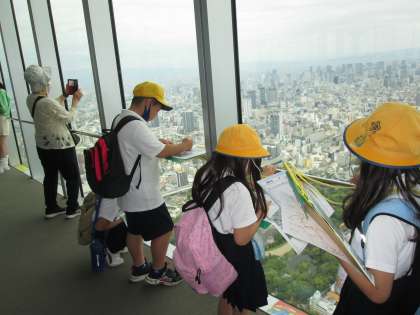 今日は天気もよかったので、遠くまで見て、大阪の様子を知ることができましたね。見学メモに一生懸命書き込んでますね!!