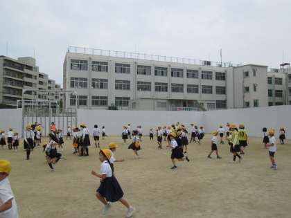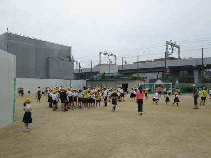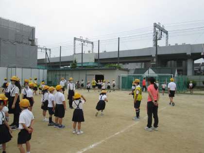 今日は黄色チームが運動場でたてわり班活動をしました。多くの班は鬼遊びをしました。他学年の子を捕まえようと走り回りました。中には、大繩をしている班もありました。