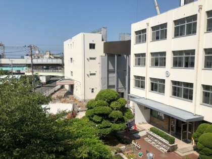 夏休みに入り、講堂を囲っていた足場が一部外され、新しくなった講堂や渡り廊下が見えるようになりました。