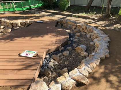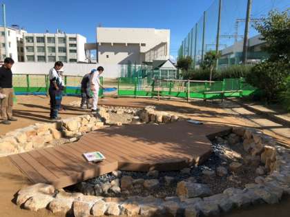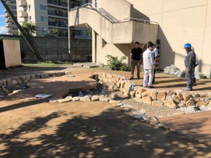 まだお水や植物はありませんが、以前よりも大きいです。岩がまだ施工されてないときは子どもが「足湯や!!」と言っていたそうです。