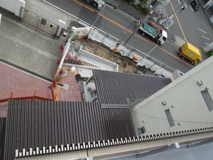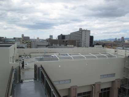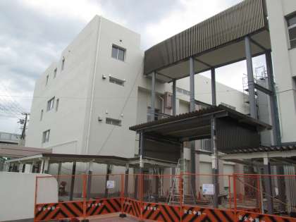 長い間講堂兼体育館の周りを囲っていた足場が解体され、全体が見えるようになってきました。屋上プールには水槽も設置されました。渡り廊下なども着々と整備されてきています。