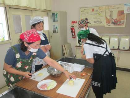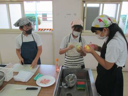 じゃがいも、たまねぎ、ハムを食べやすい大きさに切ります。それぞれどんな切り方か覚えていますか?