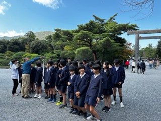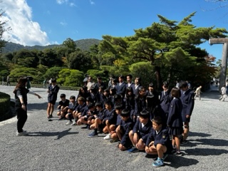 ?宇治橋を渡った所でクラス毎の写真を撮りました。神苑の緑、澄んだ秋空、子ども達の笑顔‥