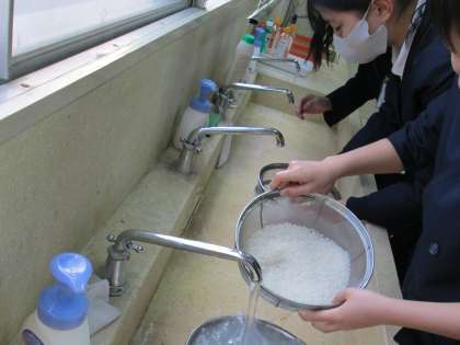5年生の調理実習です。まずは、朝のうちにお米を研ぎました。