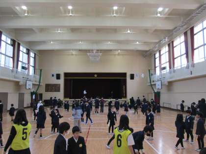 今日の集会はたてわり遊びでした。運動場では大繩や鬼遊び、講堂では輪投げや羽根つき、教室ではフルーツバスケット等を楽しみました。
