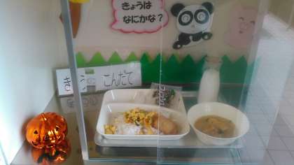 11月2日(月)今日のメニューは、かつ丼・味噌汁・ミニフィッシュとごはんと牛乳です。かつ丼の卵は個別対応給食で除去しています。