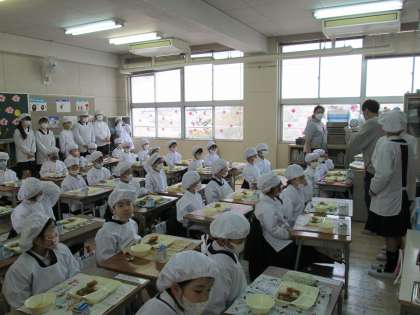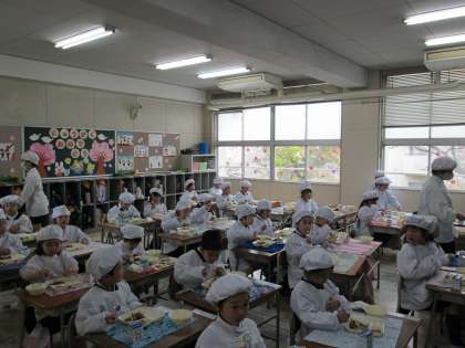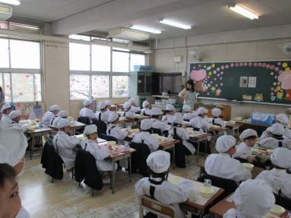 1年生にとっては初めての給食です。小学校生活に慣れるまでの数週間は、6年生が給食の準備をしてくれます。さすが6年生、短時間で配膳まで終えることができました。
