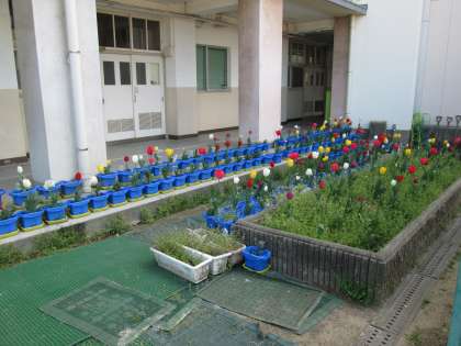 2年生が昨年度に植えたチューリップが綺麗に咲いています。毎日水やりをしてお世話をがんばったからですね!!