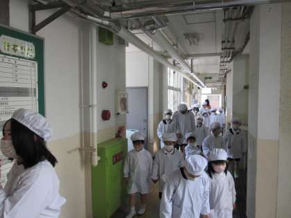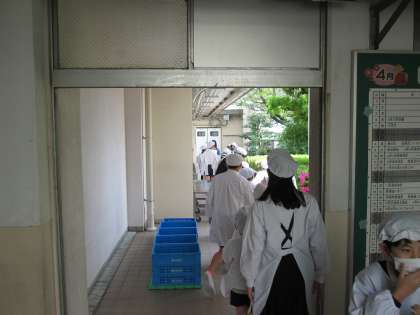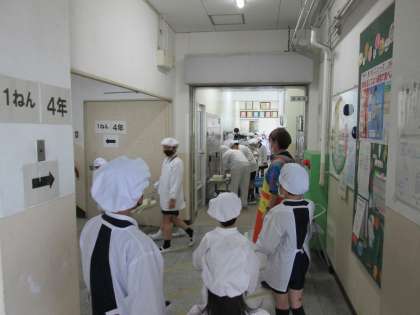 今週は1年生が6年生と一緒に給食の運搬、配膳をします。先週は6年生がしてくれていたことを一緒にしながらやり方を学びます。