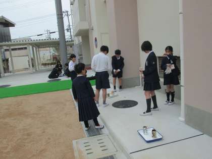 6年生が理科で「ものが燃えるしくみ」の学習をしました。どうすれば火が大きくなるのかを考えます。空き缶に開いた穴の位置によって燃え方にちがいがありましたね。