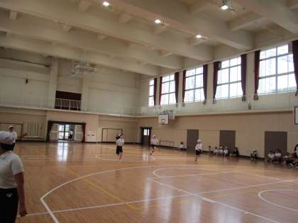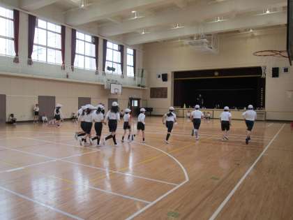 6年生が20mシャトルランに取り組みました。電子音に合わせて、20mを往復します。何回往復できるかを計測し、持久力を測定します。
