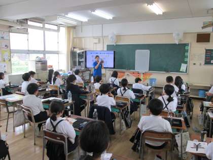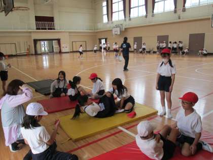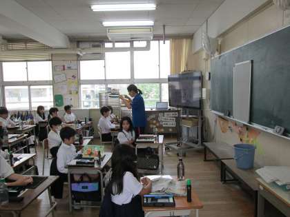 4年生では、書写と体育科の学習をしました。道具の配置の仕方や道具の名前等、1つ1つていねいに確認しました。毛筆は、力の加減を変えることで、いろいろな太さの線を書くことができます。習字を苦手に感じる子どもも多いですが、毛筆の学習は筆順の学習にもつながりますし、お手本を観察することで漢字を覚えることにもなります。