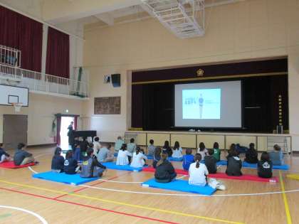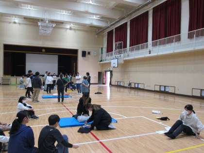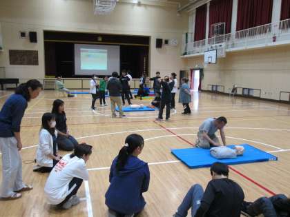 講堂で教職員とPTAとで救命救急講習会を実施しました。事故が万一起きたときの備えです。DVDを視聴した後、実際に人形を使って心肺蘇生法を1人1人行いました。初めてされる方も数人いましたが、とてもスムーズでした。