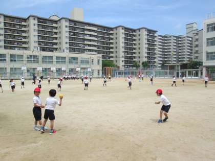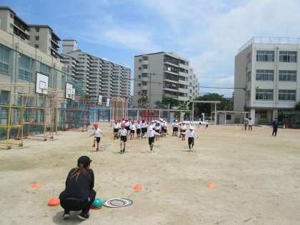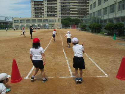 2年生が体育科の学習でボール投げをしたり、かけっこをしたりしました。利き手と反対の手を前に出してボールを勢いよく投げていました。また、フープを使って足を速く動かす遊びも行っていました。来週にはソフトボール投げや50m走の記録を計測します。昨年度は工事の影響で実施できなかったため、2年生のみなさんにとっても初めての経験になります。楽しみですね!!